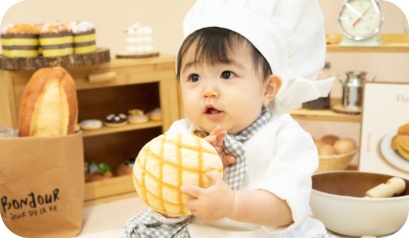 ふわふわ・もっちりのパンに囲まれたおいしそうな空間。 ボウルにバター、たまごやミルク。一生懸命な姿はパン職人そのもの。おままごとをしながら楽しく撮影ができます。オリジナルの衣装で特別なパン屋さんに大変身です!