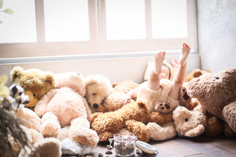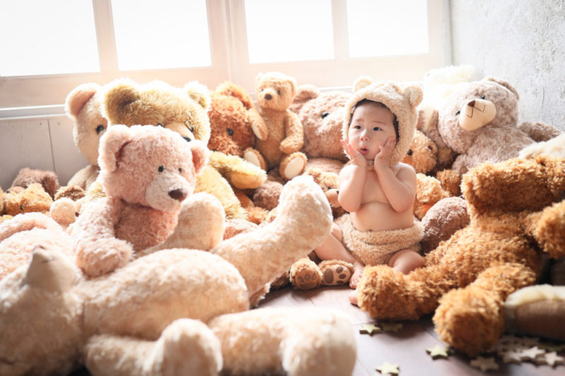 くまの着ぐるみとたくさんのくまのぬいぐるみで撮影する
