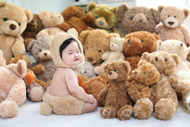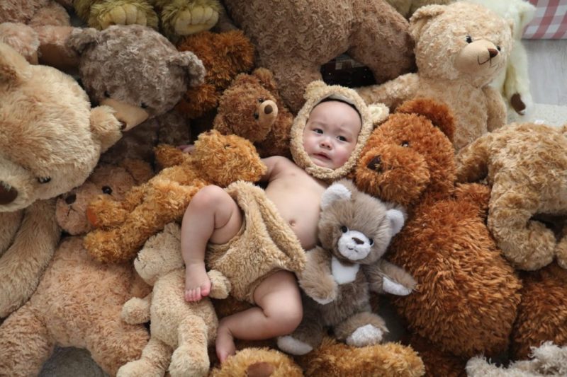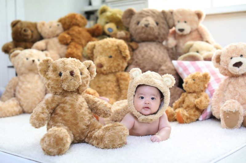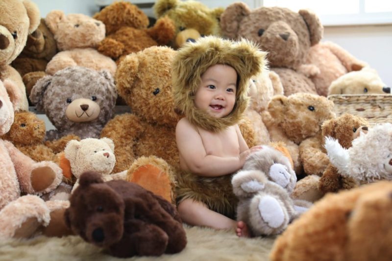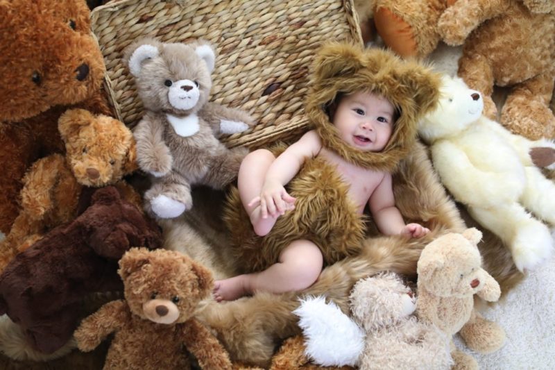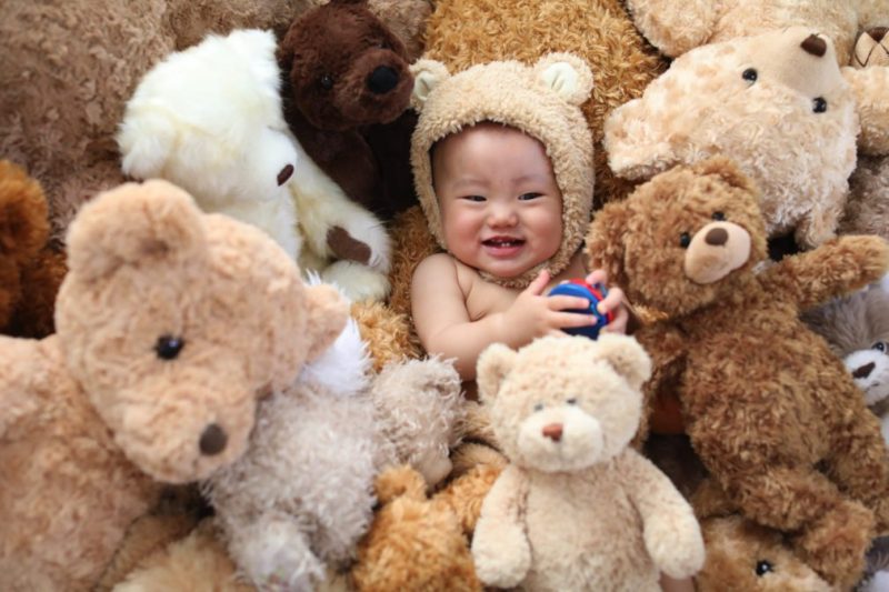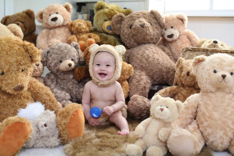 くまの着ぐるみとたくさんのくまのぬいぐるみで撮影する