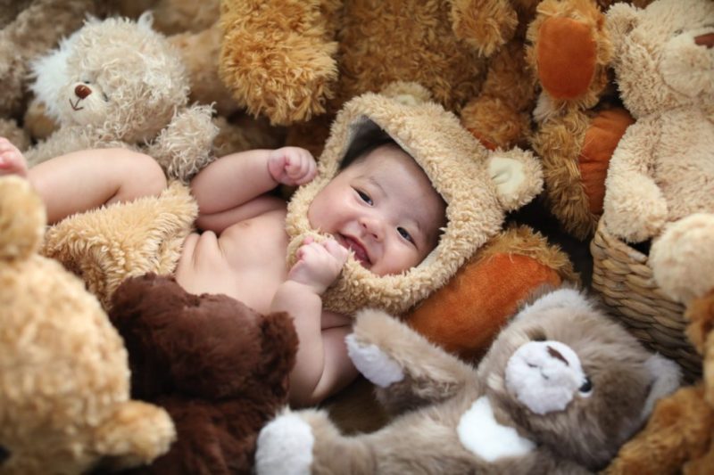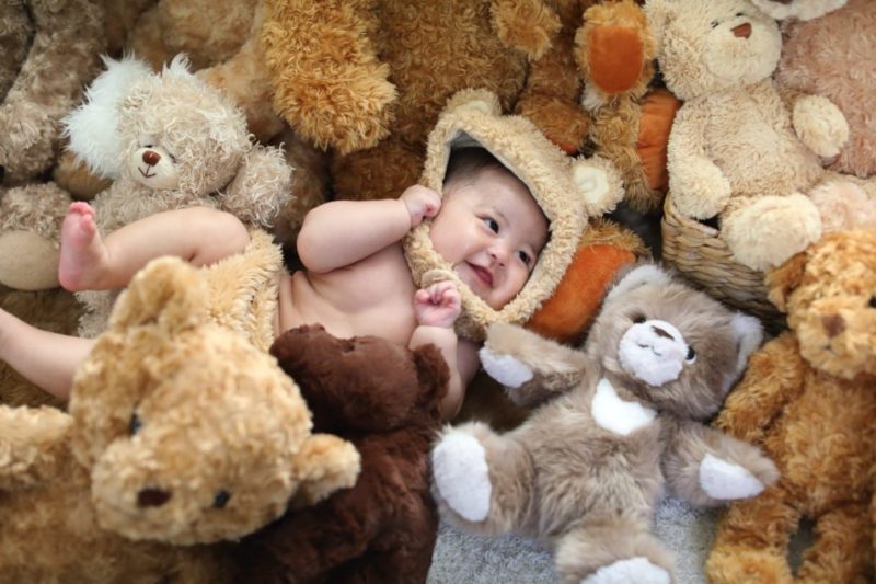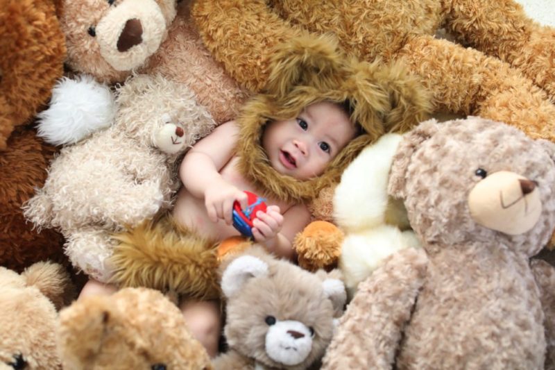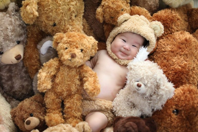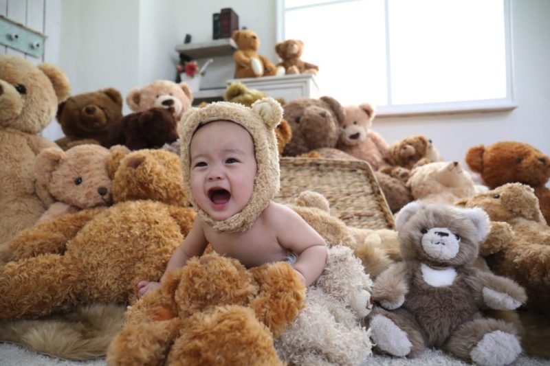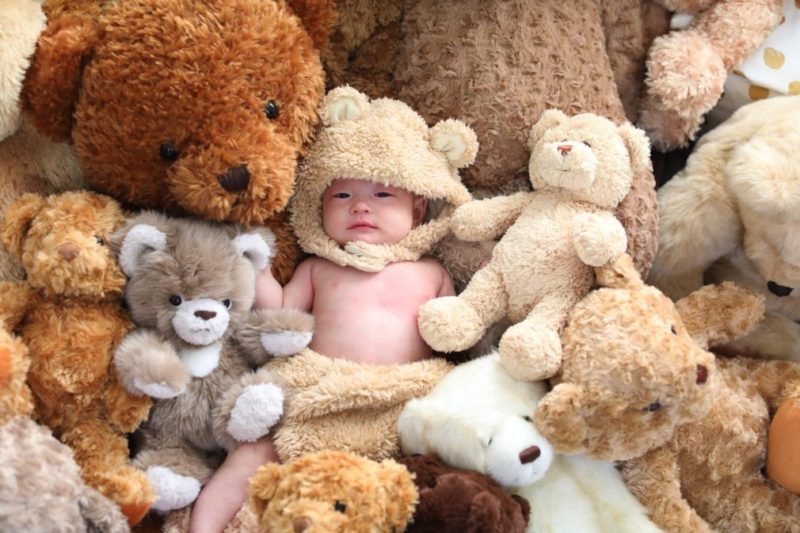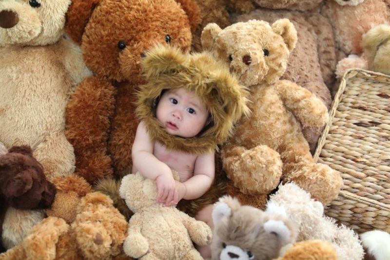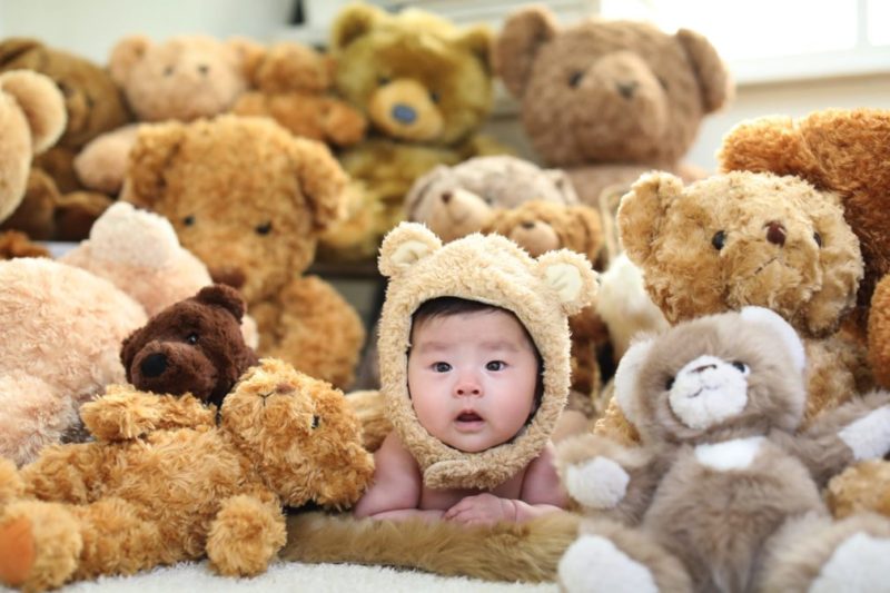 くまの着ぐるみとたくさんのくまのぬいぐるみで撮影する