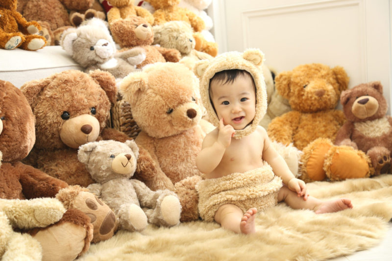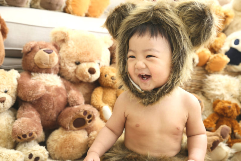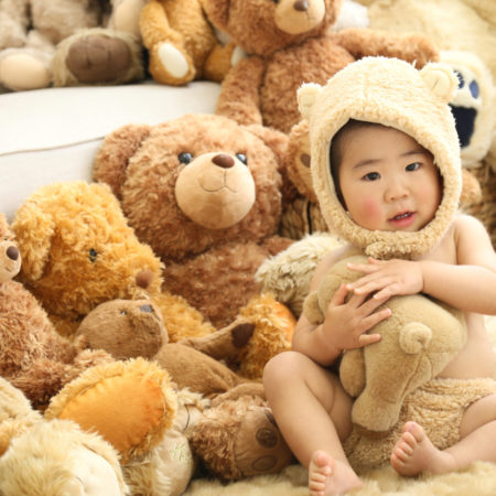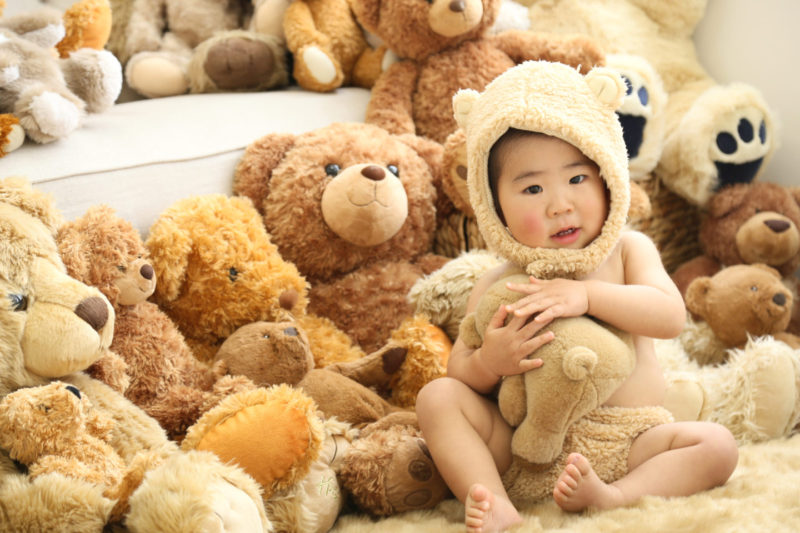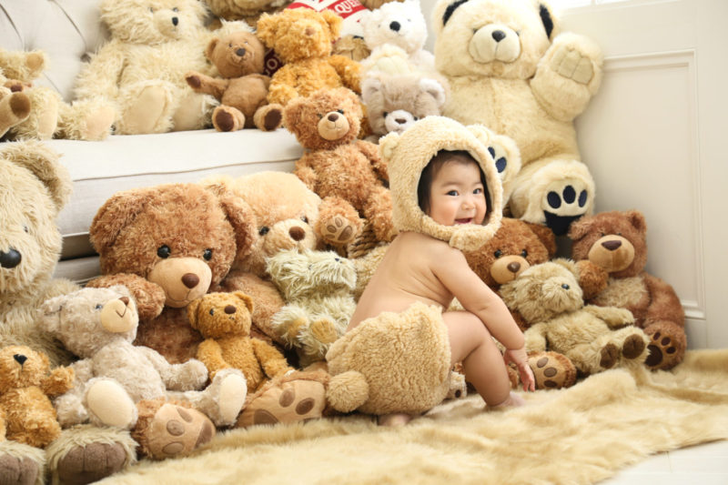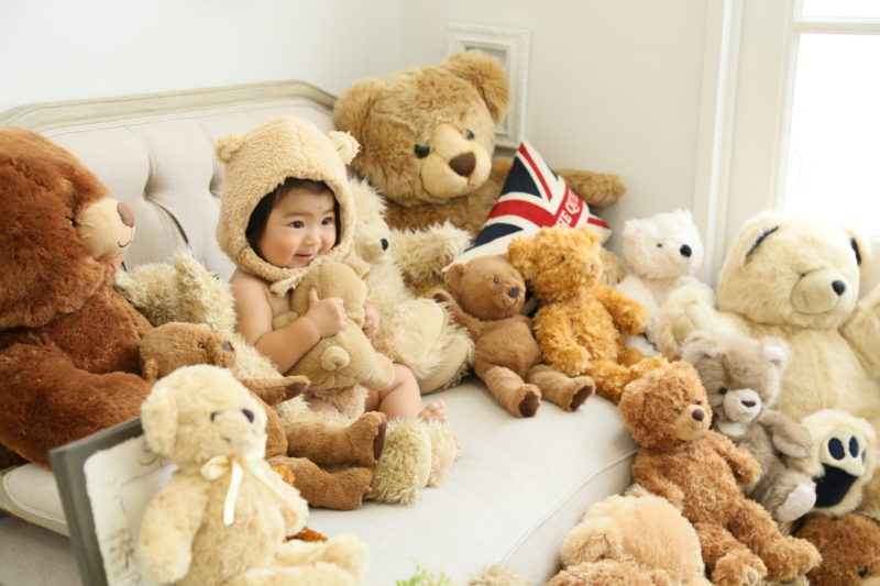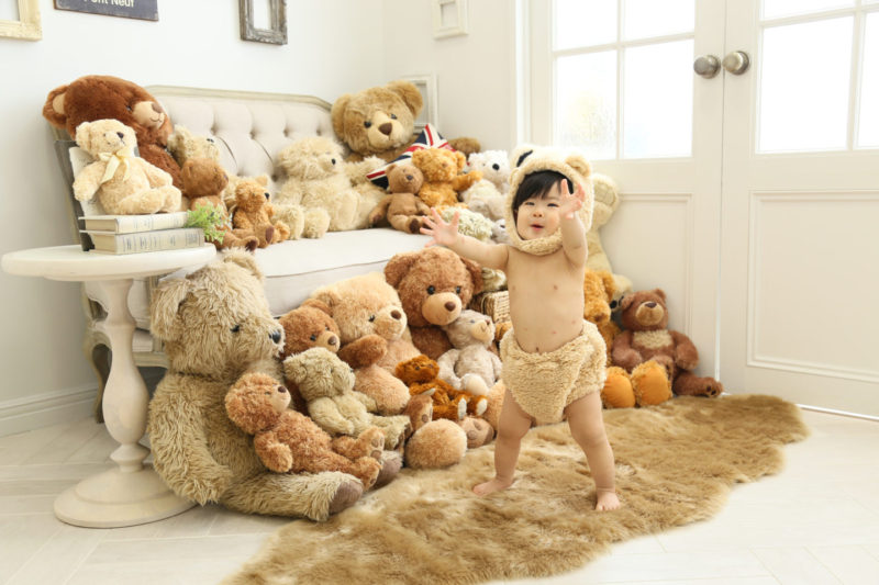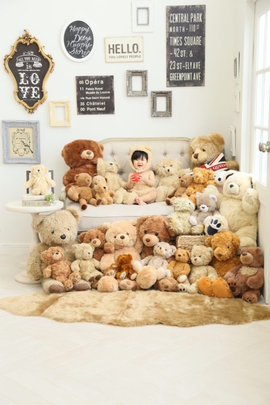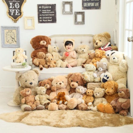 くまの着ぐるみとたくさんのくまのぬいぐるみで撮影する
