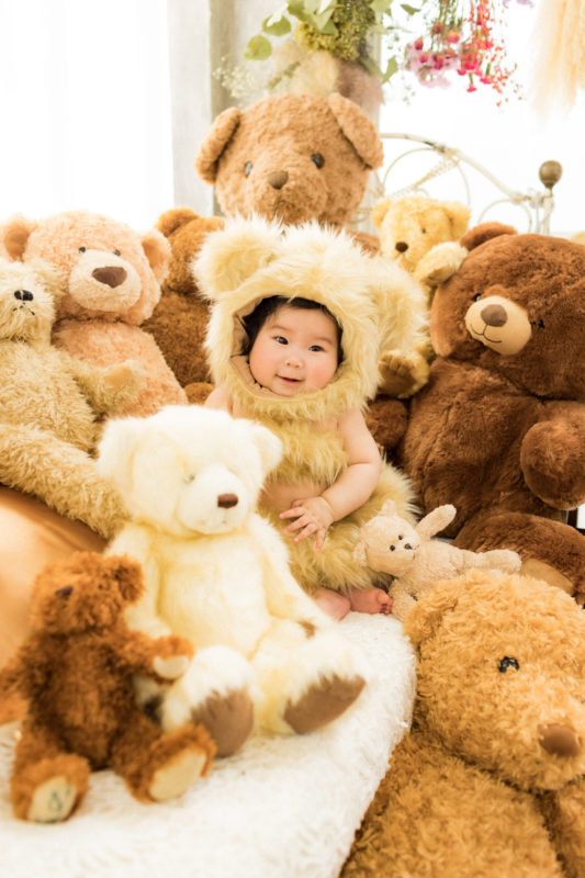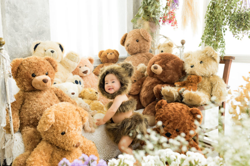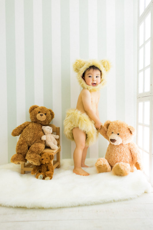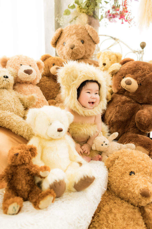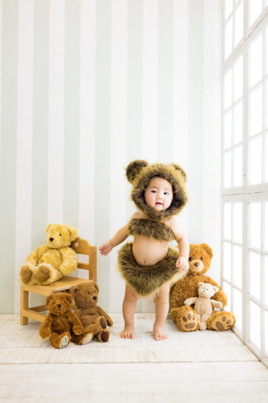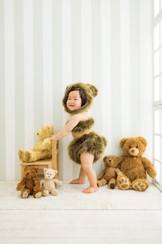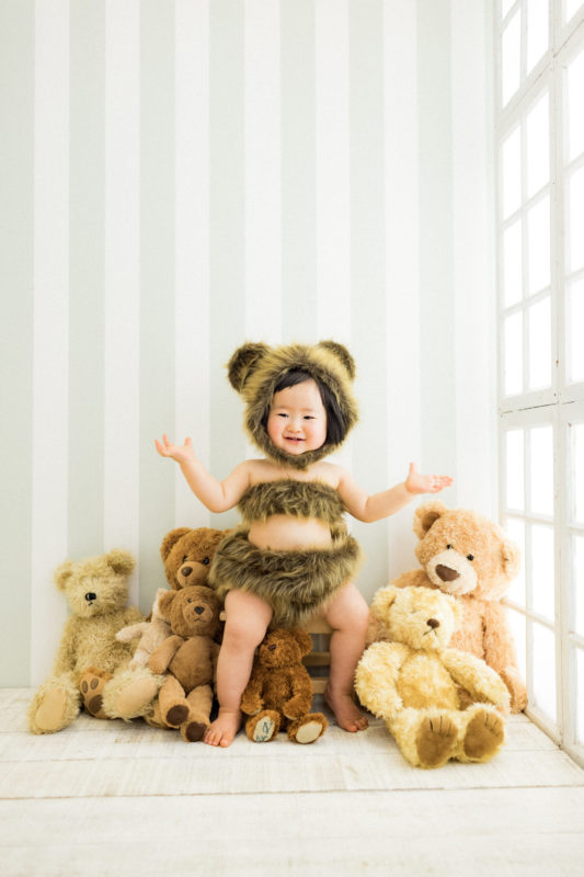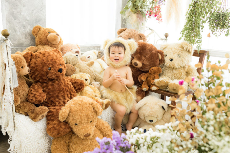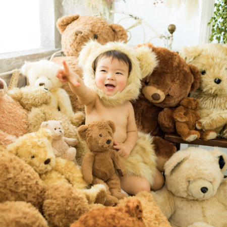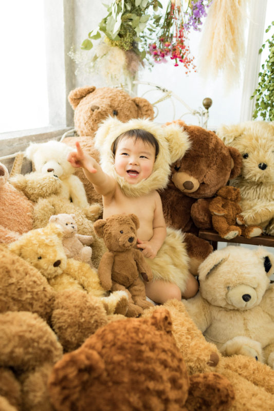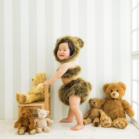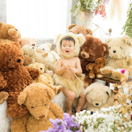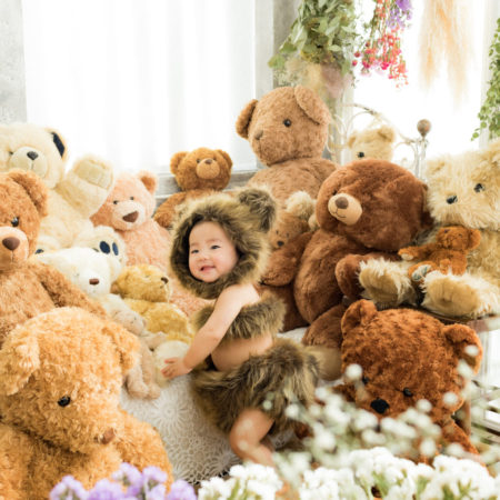 くまの着ぐるみとたくさんのくまのぬいぐるみで撮影する 「くまボーイ・くまガール撮影会」を川村スタジオで開催しました。 くまさんになりきった可愛らしい姿のお子様6名様をご紹介いたします。