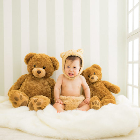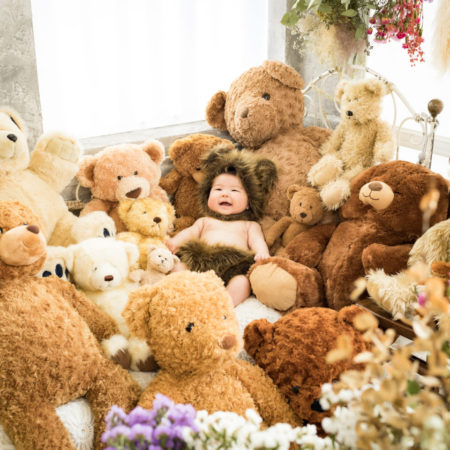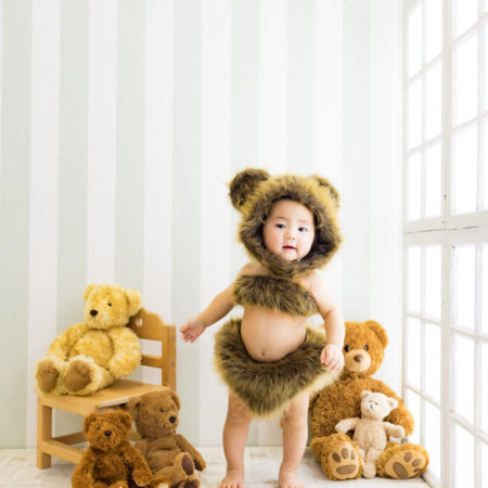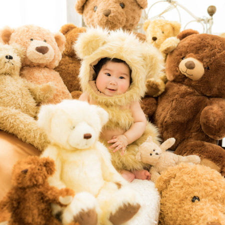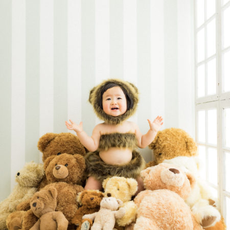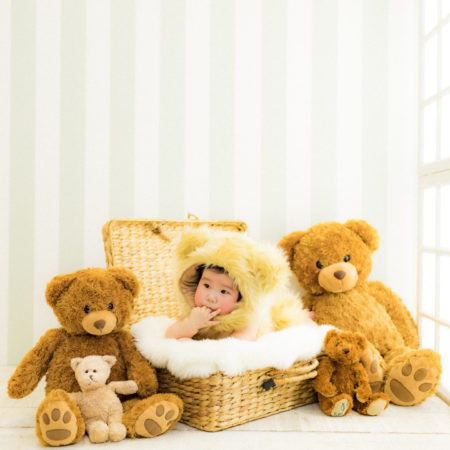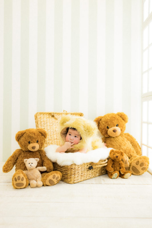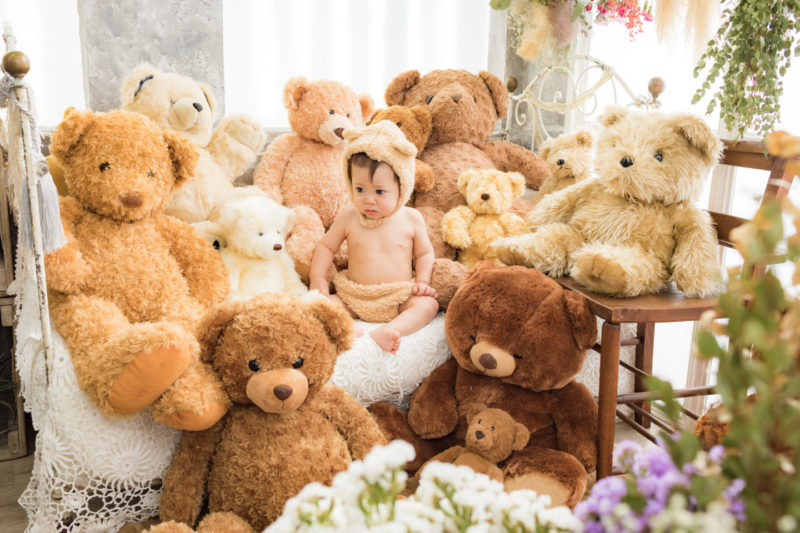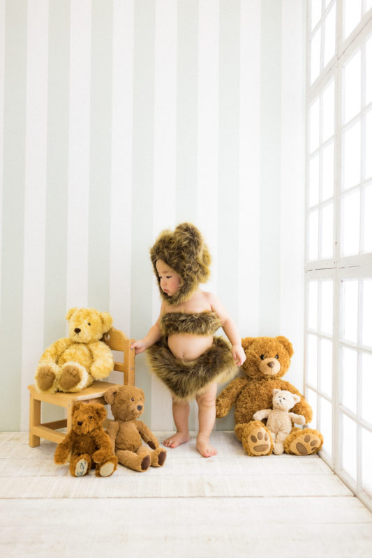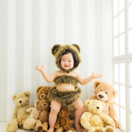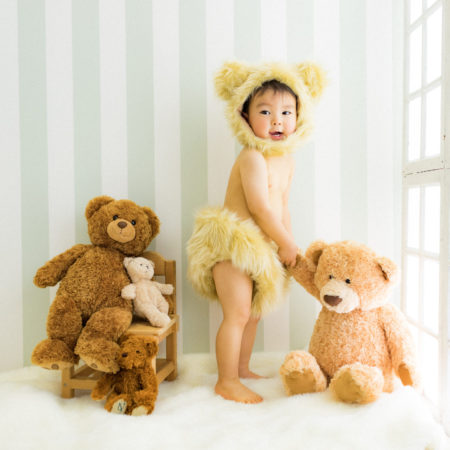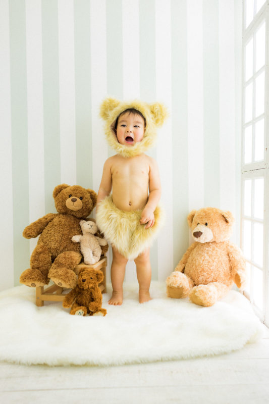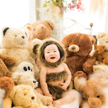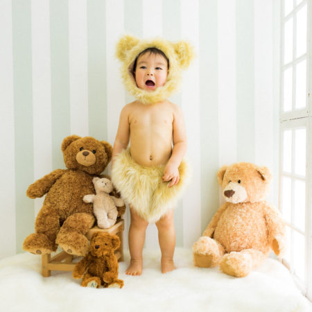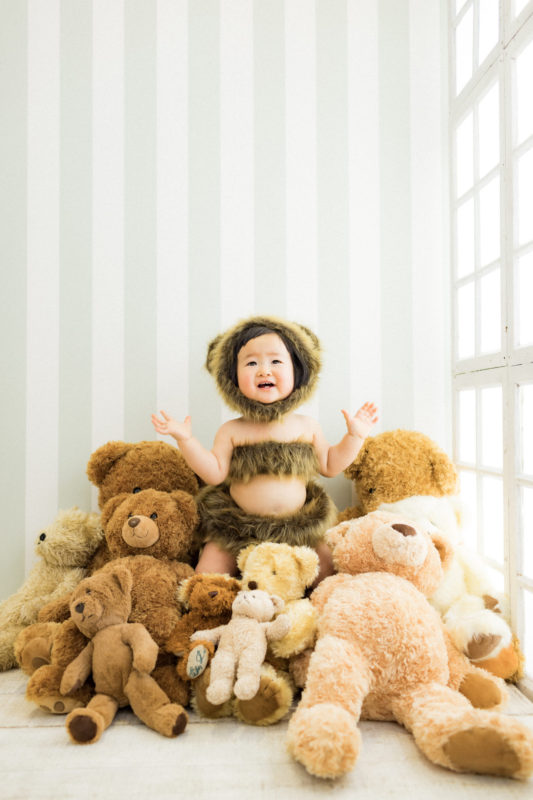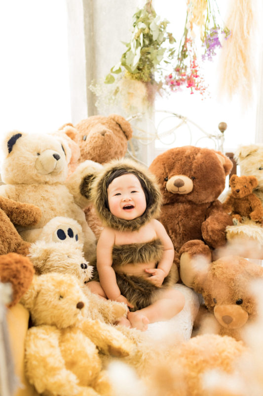 くまの着ぐるみとたくさんのくまのぬいぐるみで撮影する 「くまボーイ・くまガール撮影会」を川村スタジオで開催しました。 くまさんになりきった可愛らしい姿のお子様6名様をご紹介いたします。