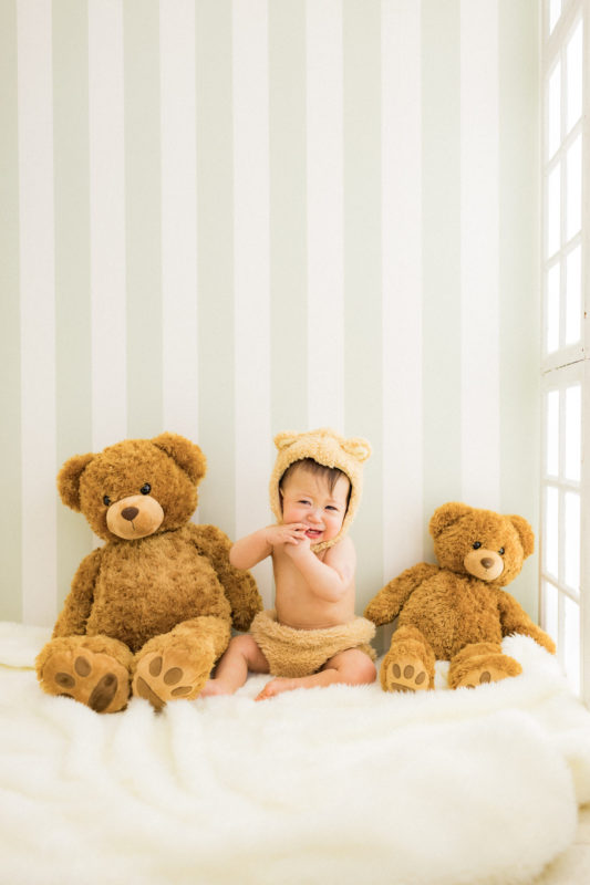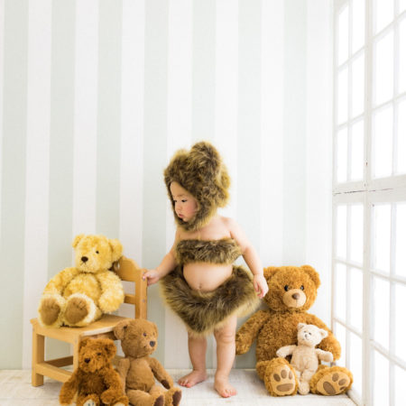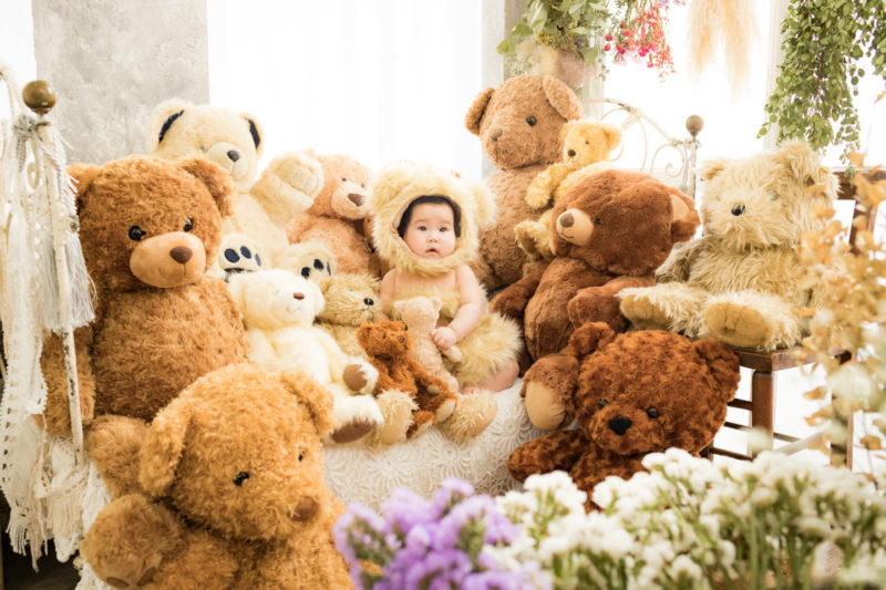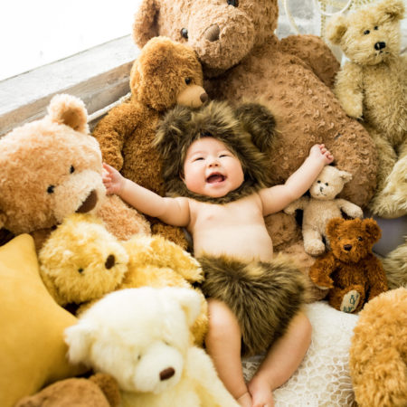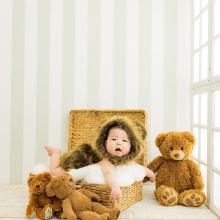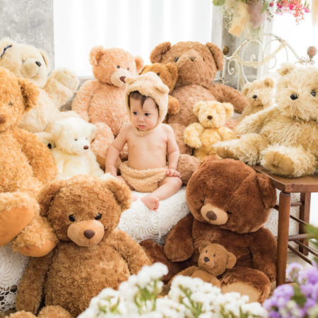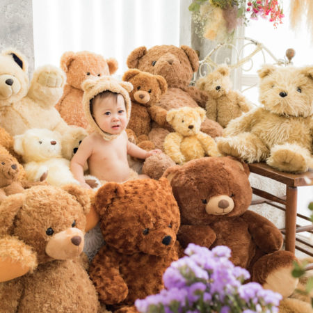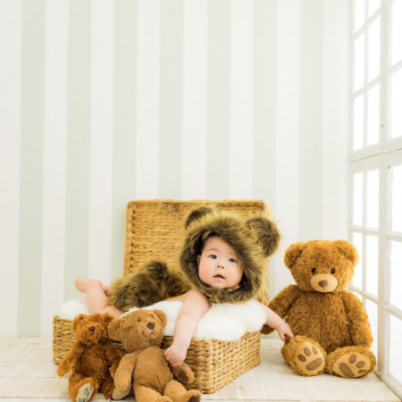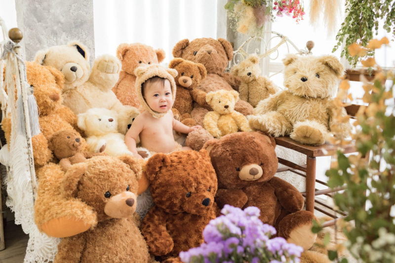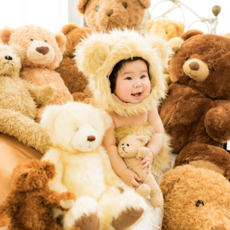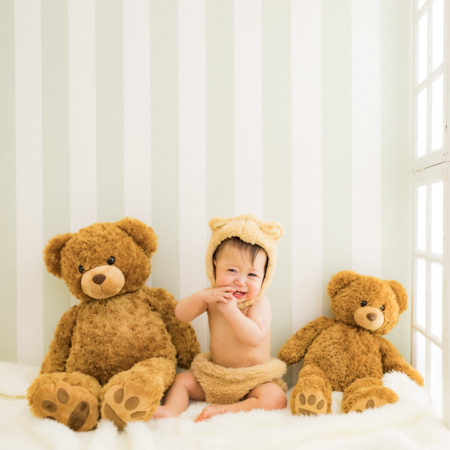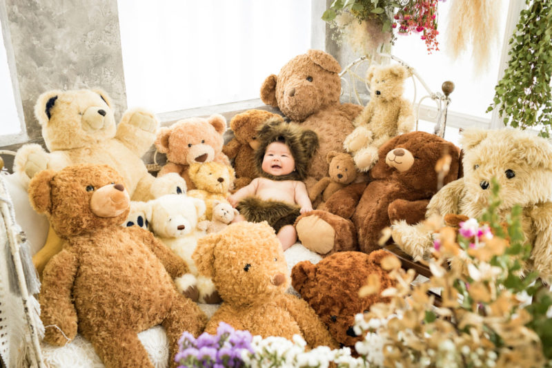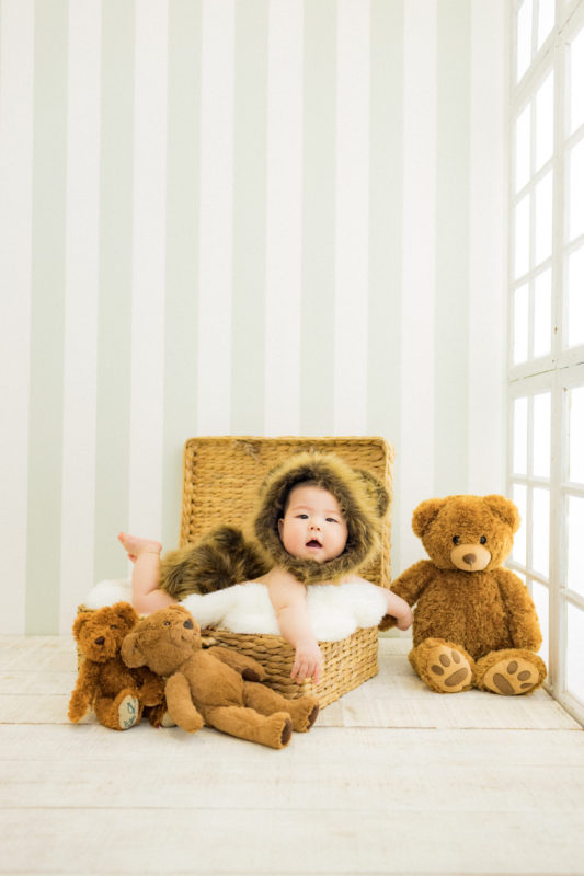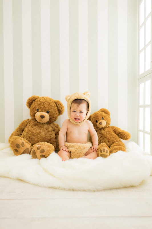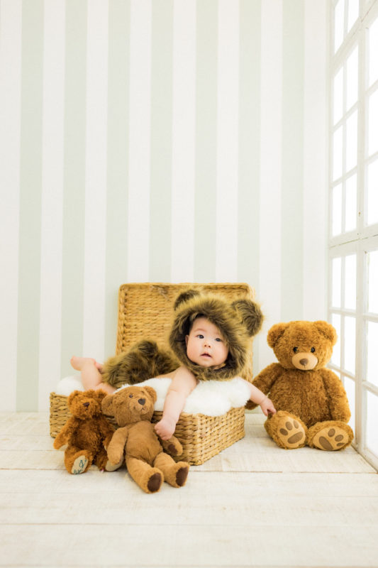 くまの着ぐるみとたくさんのくまのぬいぐるみで撮影する 「くまボーイ・くまガール撮影会」を川村スタジオで開催しました。 くまさんになりきった可愛らしい姿のお子様6名様をご紹介いたします。