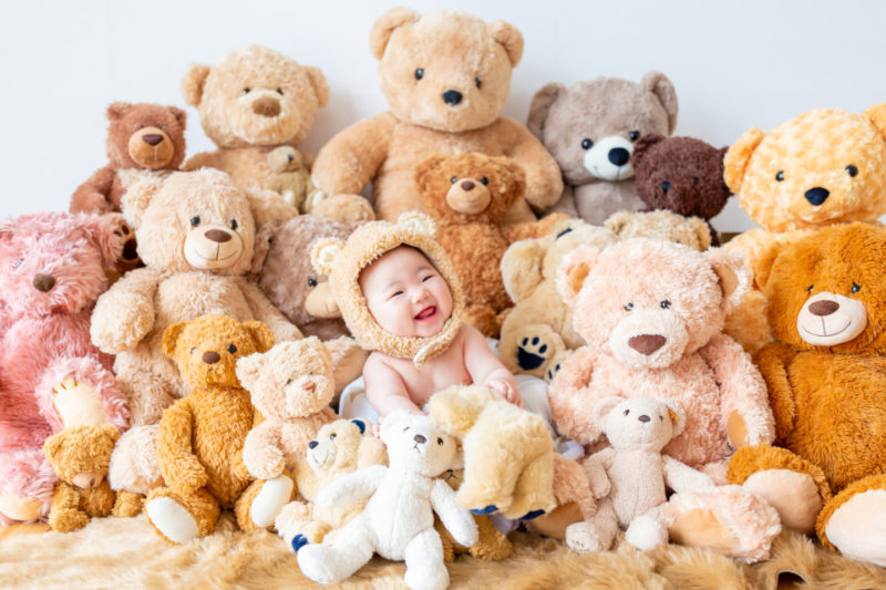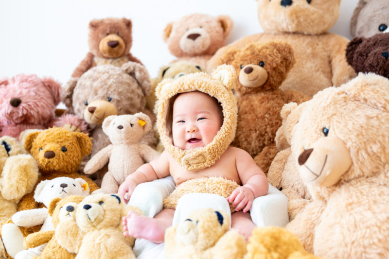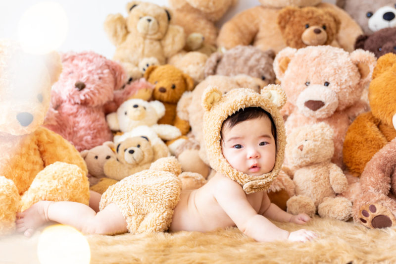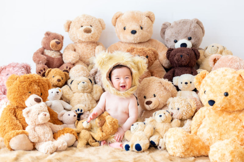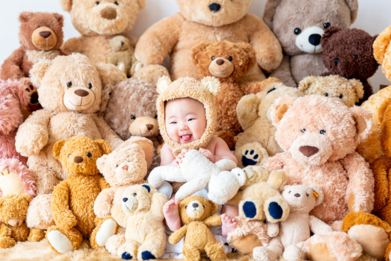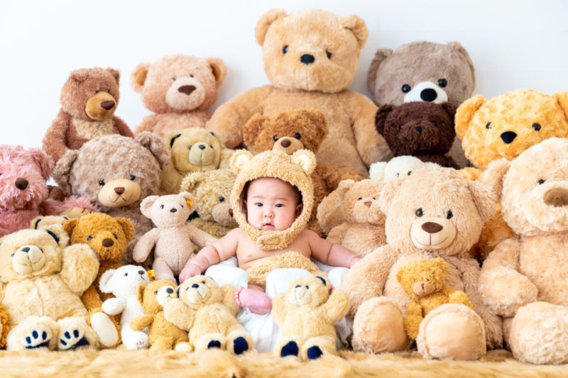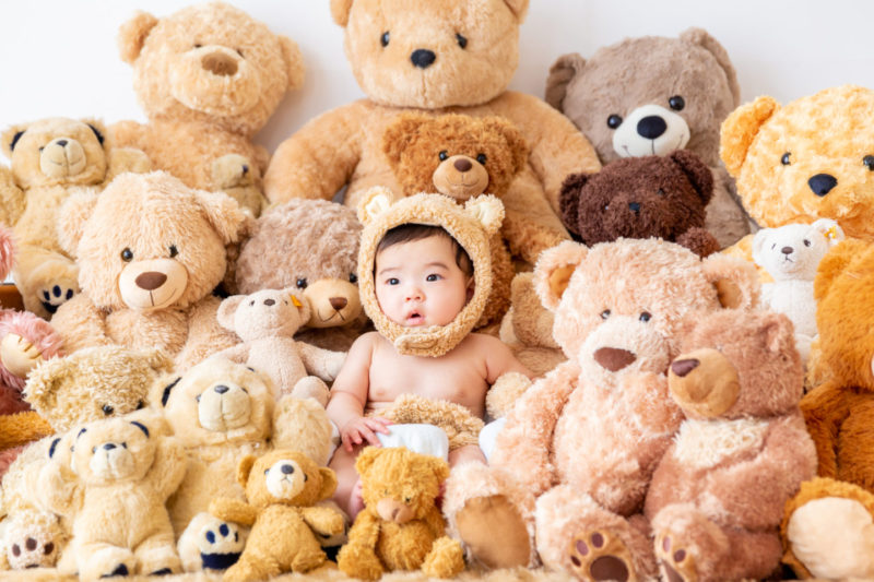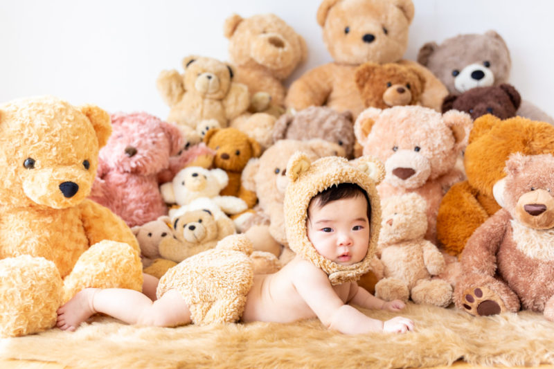 くまの着ぐるみとたくさんのくまのぬいぐるみで撮影する