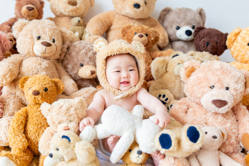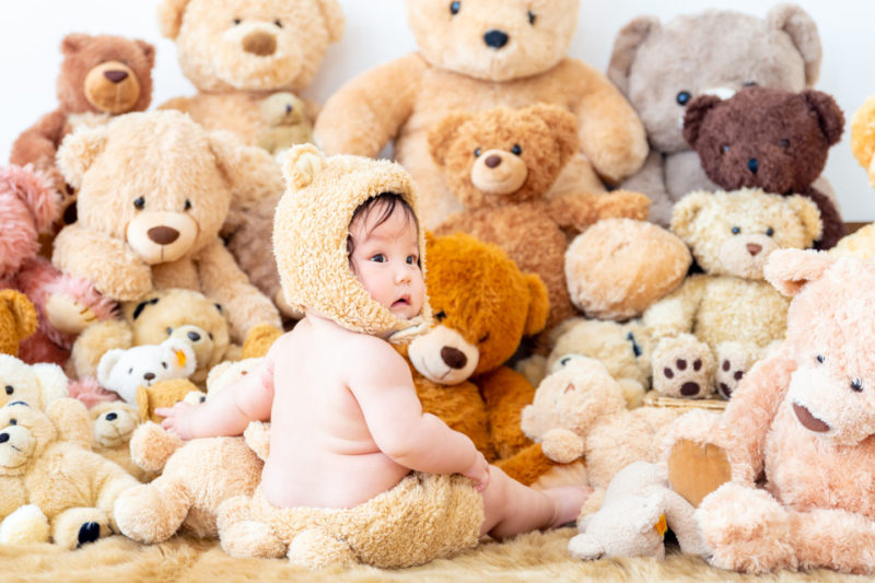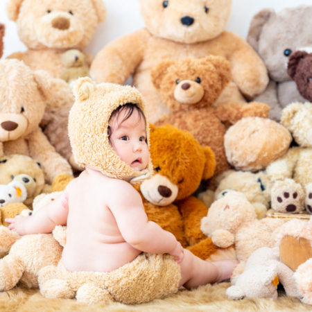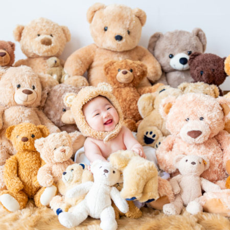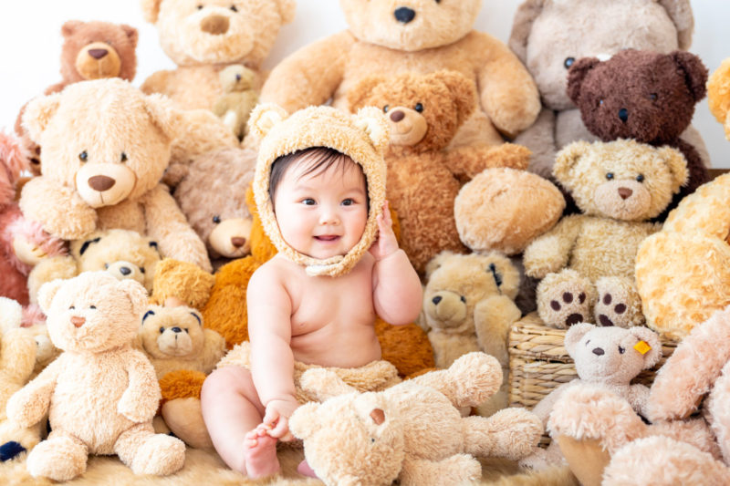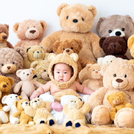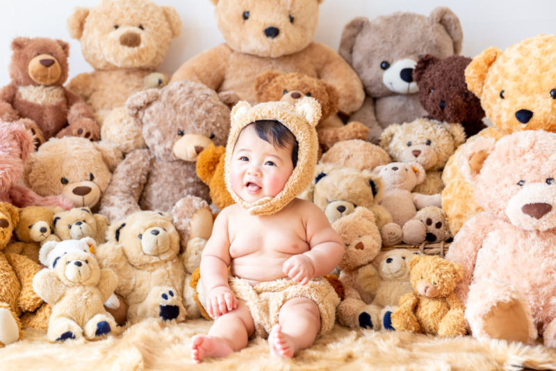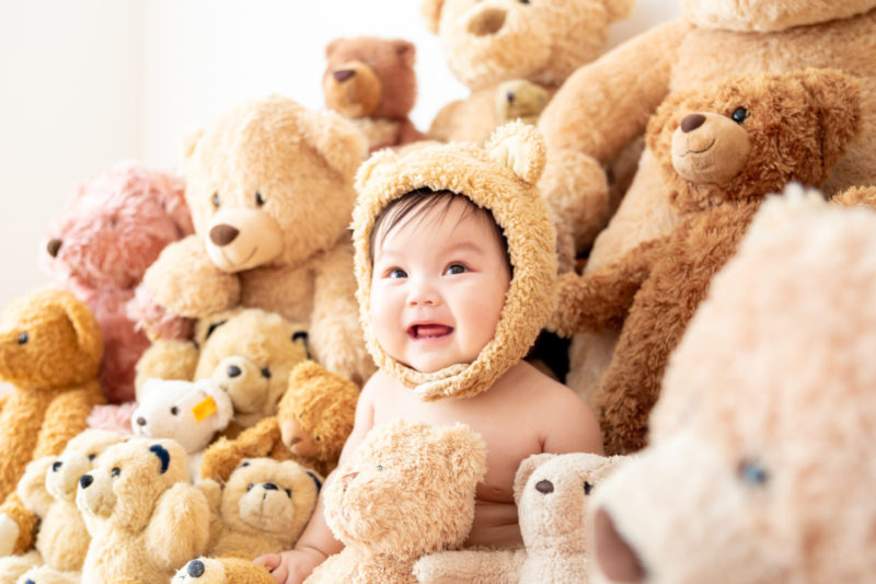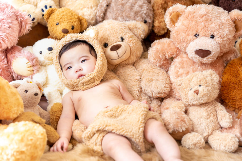 くまの着ぐるみとたくさんのくまのぬいぐるみで撮影する