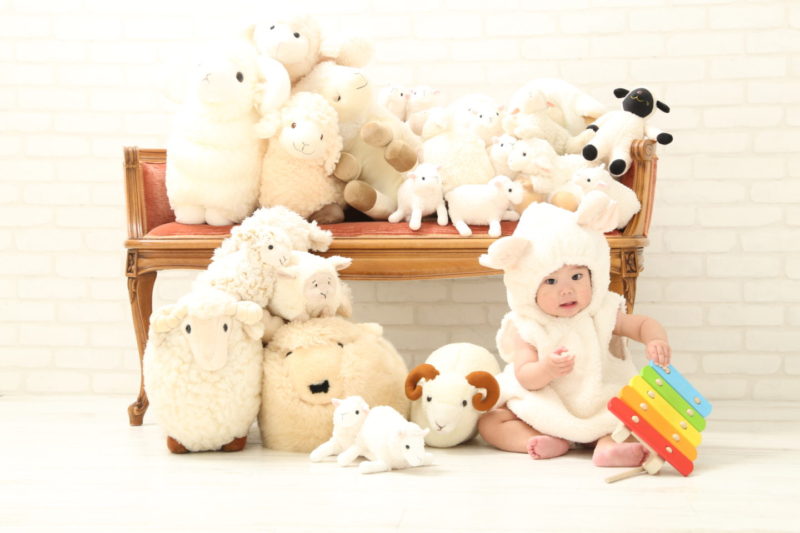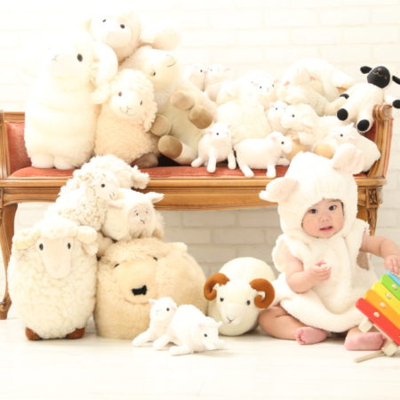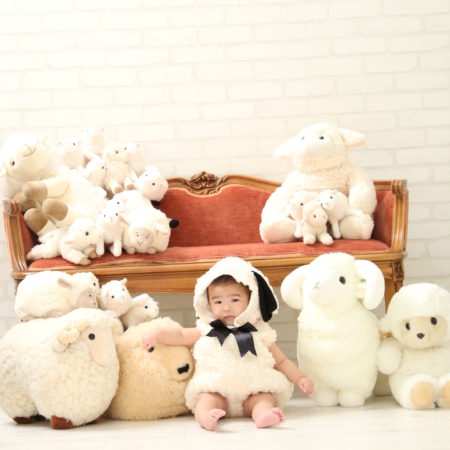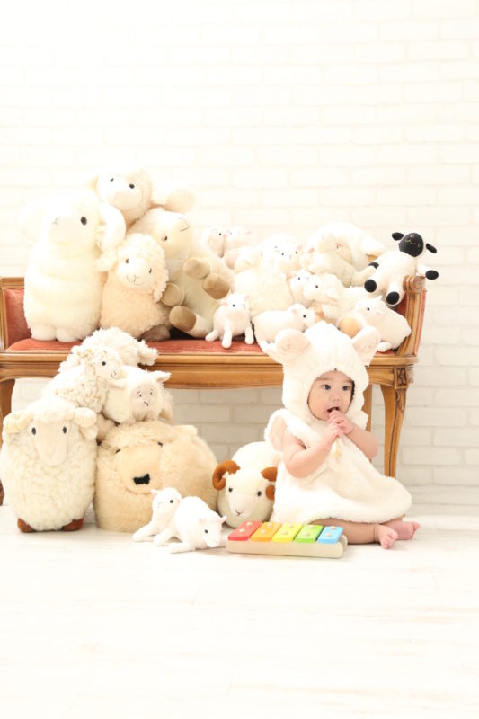 ひつじのコスチュームを着て たくさんのひつじさんぬいぐるみと撮影する