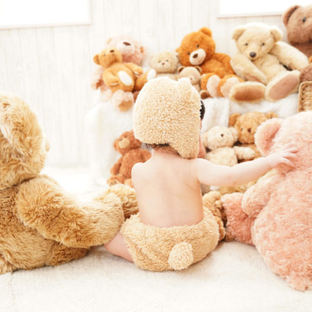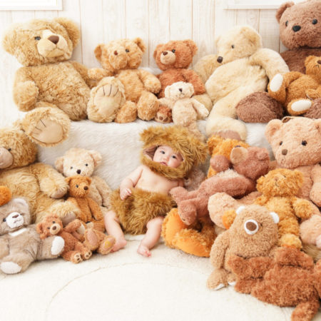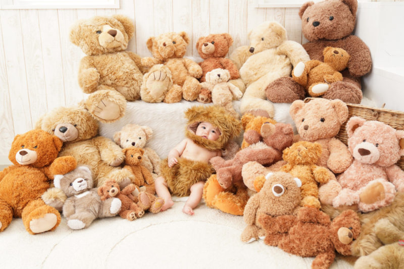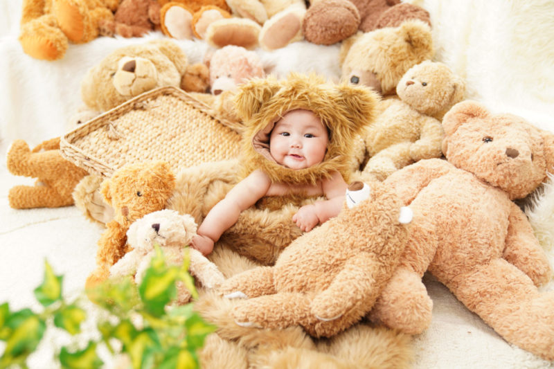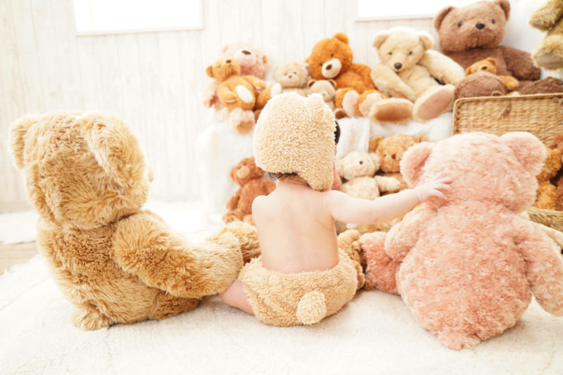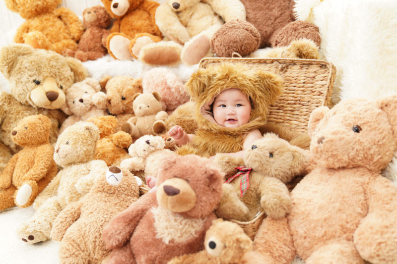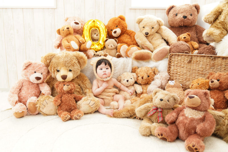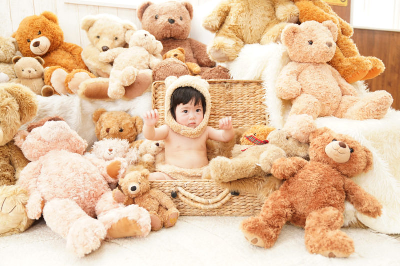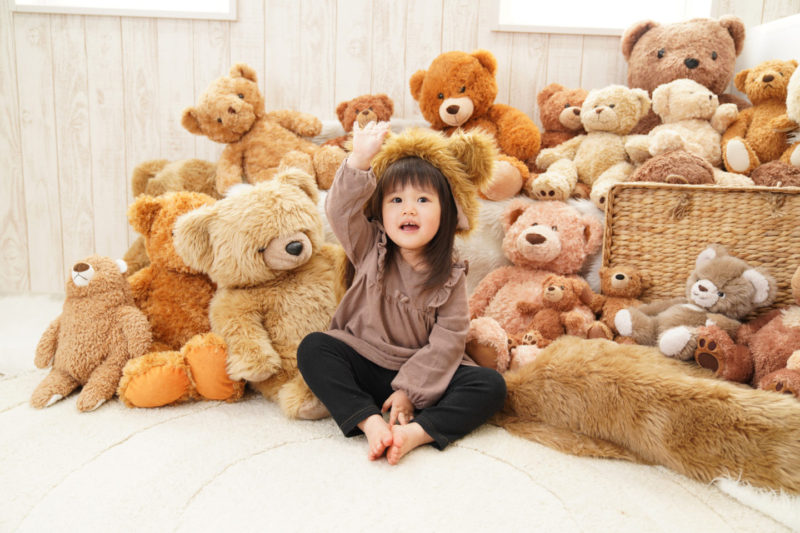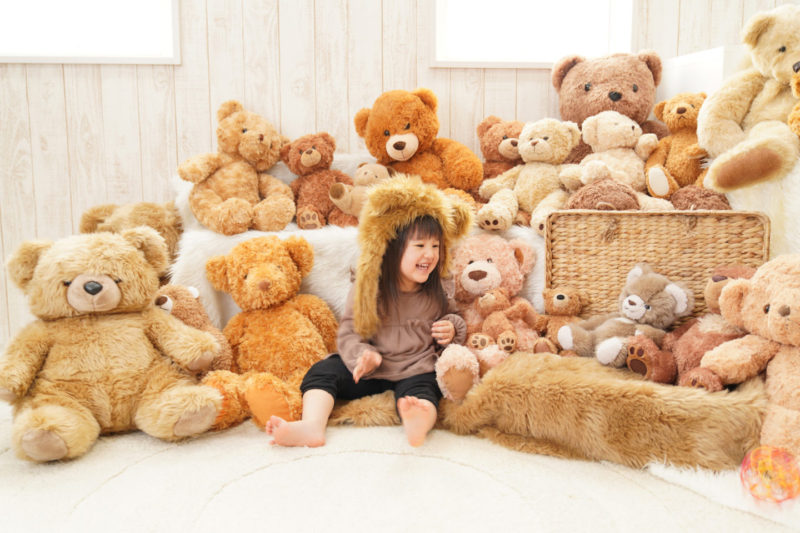 くまの着ぐるみとたくさんのくまのぬいぐるみで撮影する
