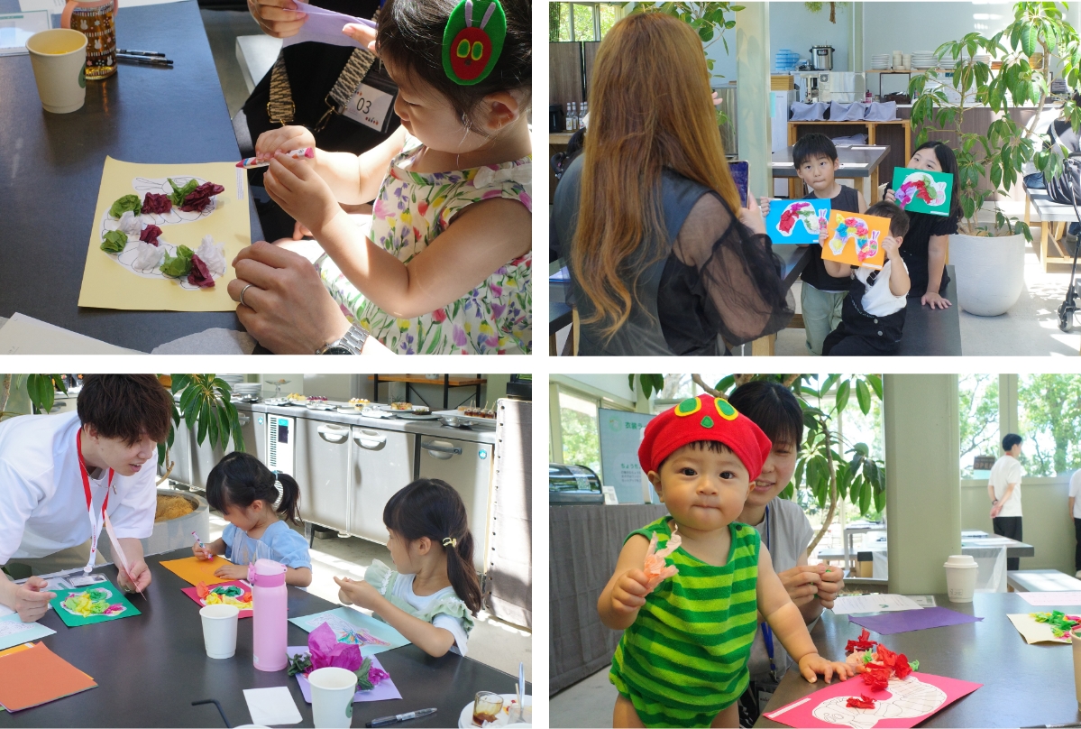 ワークショップでは、親子で一緒に楽しめる花紙を使った工作やぬりえをご用意いたしました。 ちぎったり、はったり、たくさんの色であおむしとちょうちょを塗ってみたり・・ 完成後「できたよー!」と元気よく見せてくれるお子さまたちも沢山いらっしゃいました。